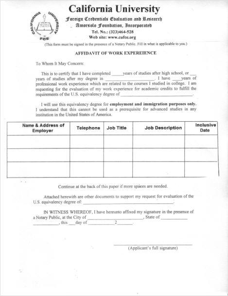 Affidavit of Work Experience for Academic Credits